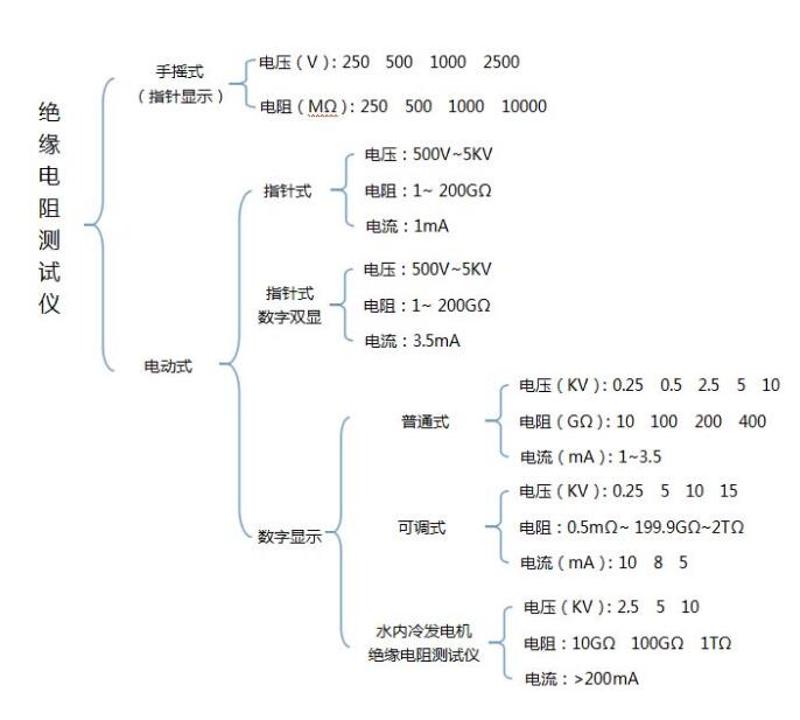絕緣電阻測試儀按操作方式數(shù)可分為手搖式、電動式;絕緣電阻測試儀按顯示方式可分為數(shù)顯示、指針式;絕緣電阻測試儀按功能特點可分帶吸收比及極化指數(shù)、不帶吸收比及極化指數(shù)等。